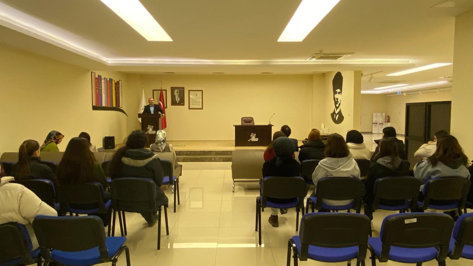 Ziyaret kapsamında Kütüphane ve Dokümantasyon Daire Başkanı Sayın Dr. Özcan Büyükgenç, öğrencilerle bir araya gelerek fakültemizin akademik yapısı, sunduğu eğitim imkânları ve kütüphanemizin sağladığı basılı ve dijital kaynaklar hakkında kapsamlı bilgiler paylaştı.